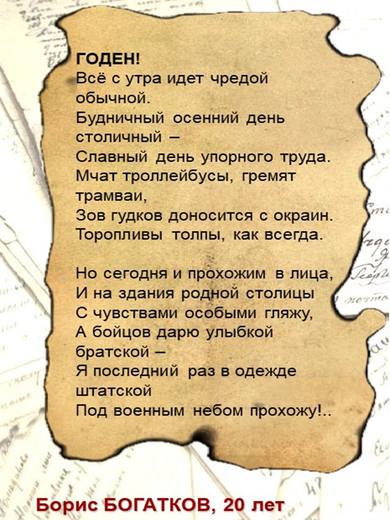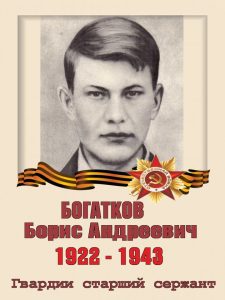 В бою за Гнездиловские высоты (у деревни Гнездилово Калужской области) Борис Богатков, подняв 11 августа 1943 года под шквальным огнем песней собственного сочинения взвод в атаку, погиб.
