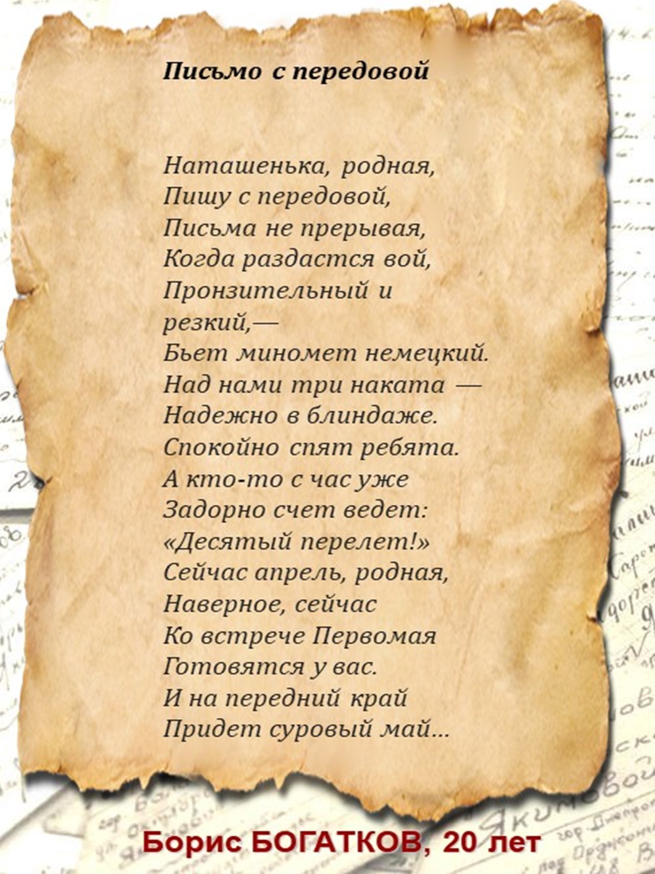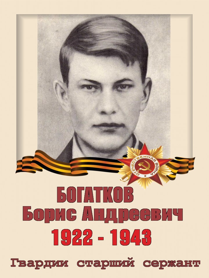 Борис Андреевич Богатков родился 2 октября 1922 года в селе Балахта Красноярского края (под Ачинском), в семье учителей. Мать Бориса умерла, когда ему было 10 лет, и воспитывался он у своей тети в Новосибирске. Осенью 1941 года добровольцем ушел на фронт. В 1942-м после тяжелой контузии вернулся в Новосибирск. Писал сатирические стихи для «Окон ТАСС», печатался в местной прессе и упорно добивался возвращения на передовую. В декабре 1942 года Борис Богатков был зачислен в состав 150-й стрелковой дивизии.