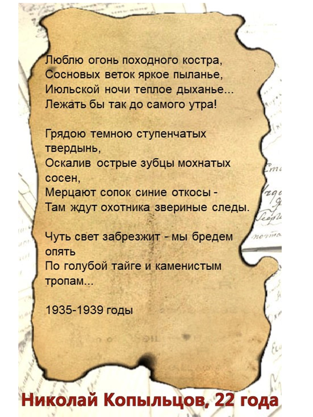 Николай Тихонович Копыльцов родился в 1917 году. Детство и школьные годы прошли на Алтае. После школы Николай поступил в Омский педагогический институт. Окончил его в 1940-м. Учительствовал на севере Томской области. Вскоре был призван в армию. Служил на Дальнем Востоке. Там заболел пневмонией, лежал в госпитале, перенес тяжелую операцию и в 1941-м поэта Николая Копыльцова сняли с воинского учета из-за тяжелой болезни, а вскоре он… ушел на фронт.