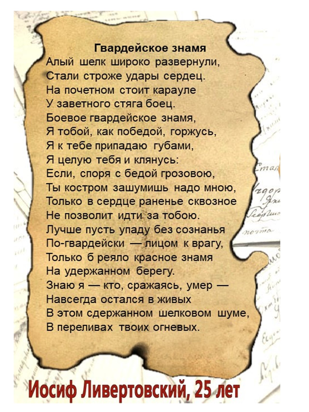 Иосиф Моисеевич Ливертовский родился 20 мая 1918 года в Херсонской губернии. В 1921 году вместе с родителями переехал в Омск. Стихи Иосиф начал писать в 16 лет. В студенческие годы публиковал их в омской газете «Молодой Сибиряк», в «Омском альманахе». В 1940 году, после окончания института, Ливертовский был призван в армию. Сначала он служил в запасных частях в Новосибирске и Бийске, а в мае 1943 года его направляют на фронт. Он командует артиллерийским расчетом, потом стрелковым отделением. Не перестает писать стихи, которые печатает в дивизионной газете «Патриот Родины».