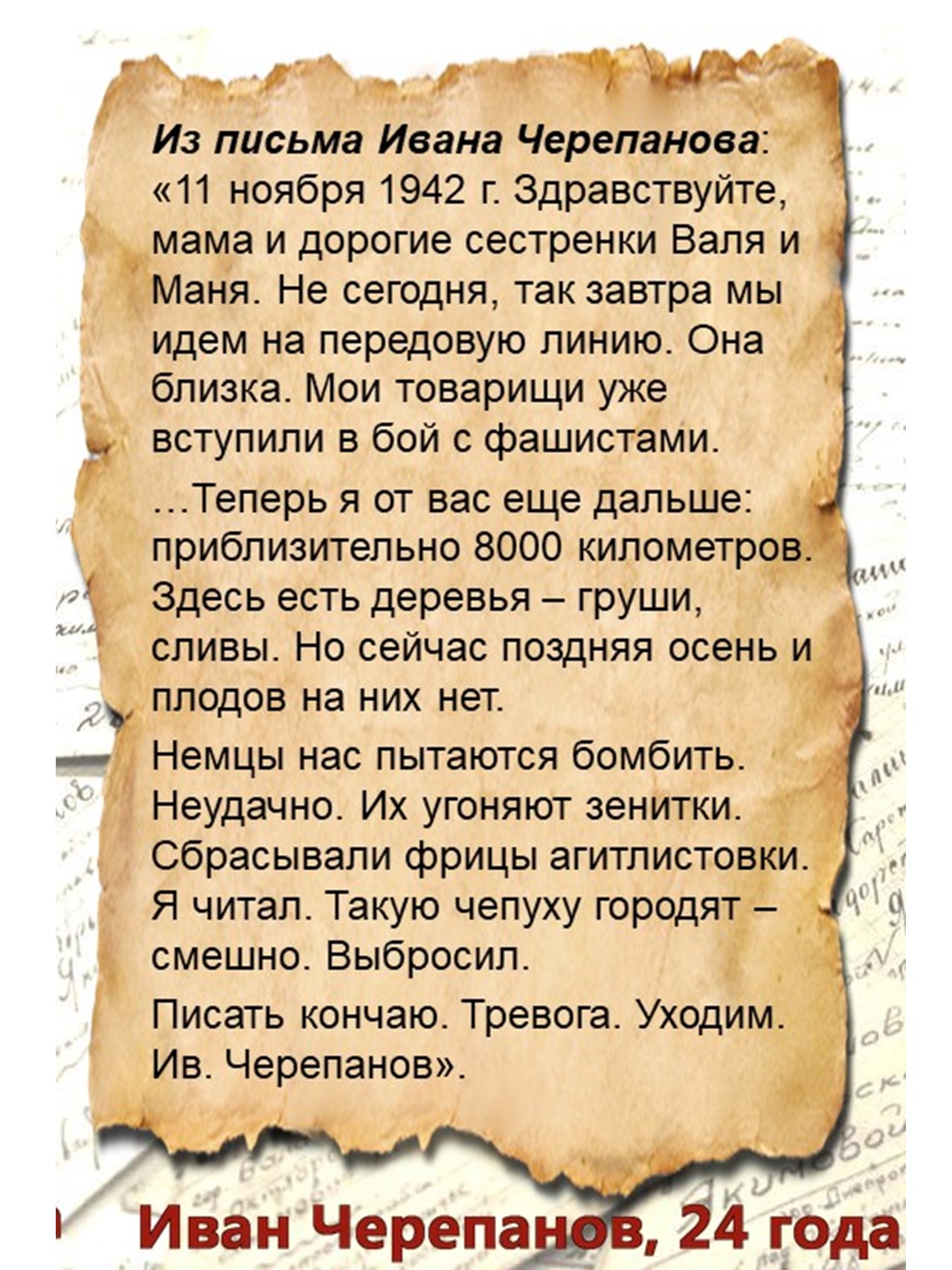 С первых дней войны Иван Черепанов — на фронте. Он погиб 2 февраля 1943г. в бою за Ростов.